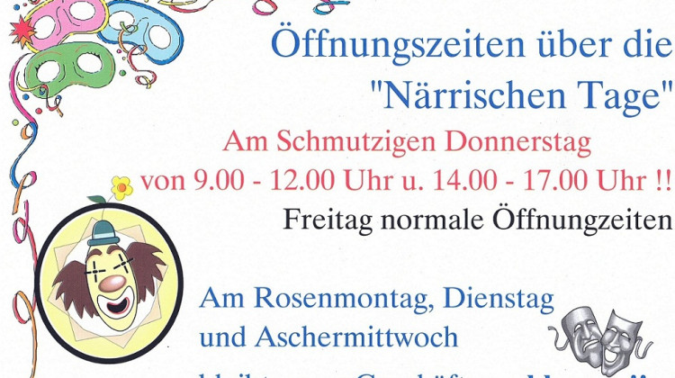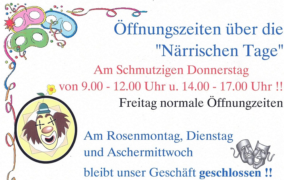 Öffnungszeiten über die Närrischen Tage